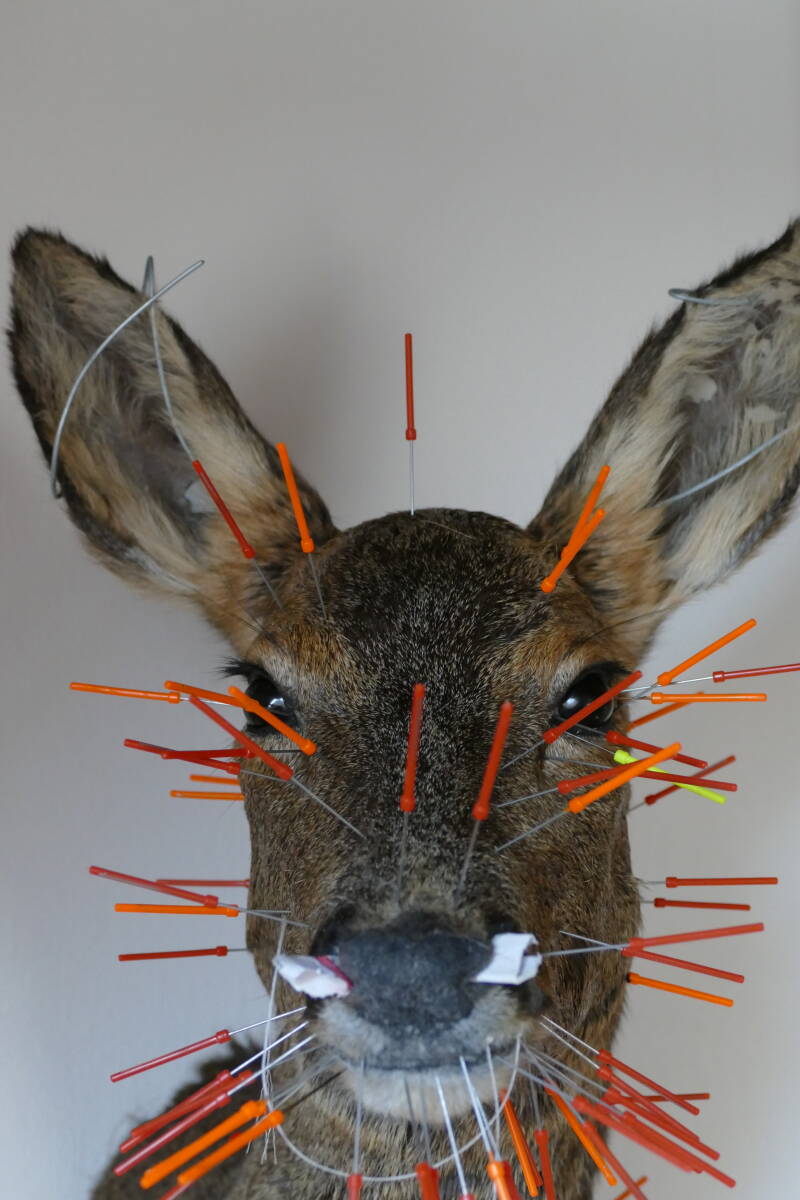 Gisteren een reegeit opgezet. Helaas was deze al te lang 'rijp' geworden voor het vlees en heeft daardoor tijdens het looiproces nogal wat haren verloren.