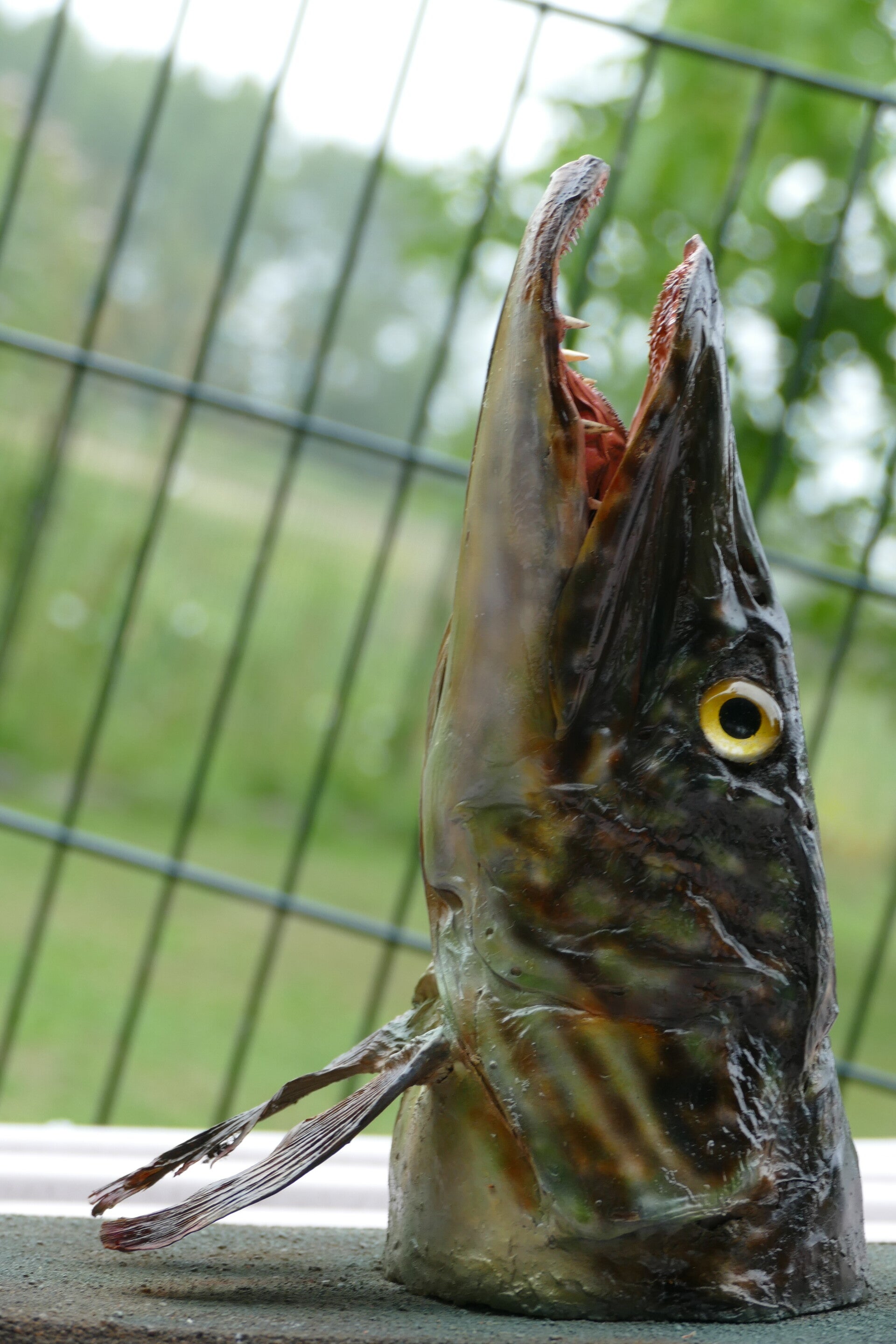 Deze 60 jaar oude snoekkop is hard toe aan restauratie. Na schoonmaken, oppoetsen van de ogen, dichten van scheuren en compleet opnieuw met airbrush, ziet de kop er weer heel anders uit.
